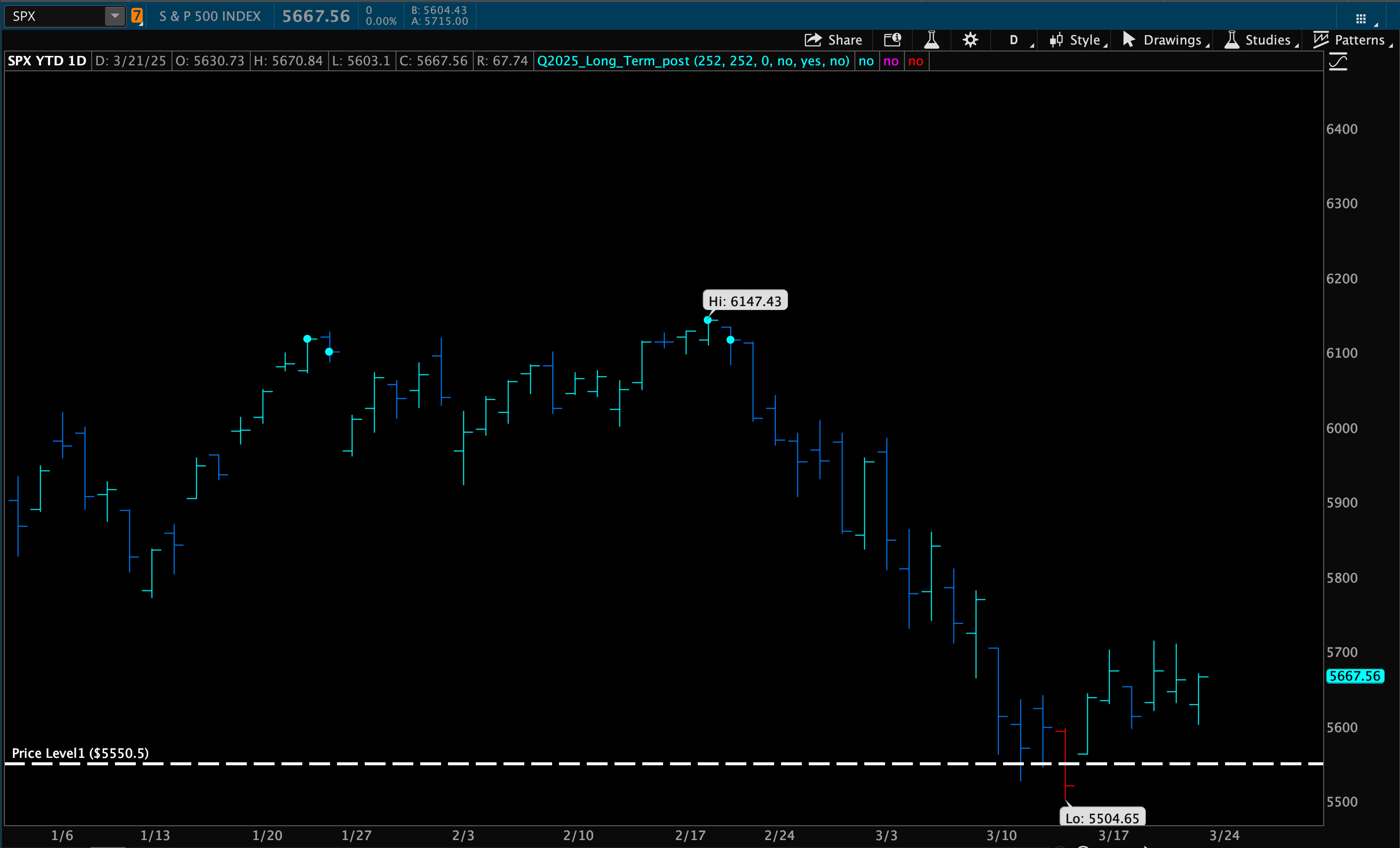 Many market metrics are flashing caution. The put-call ratio has exceeded 80% multiple times this month, and major indexes continue oscillating around their 200-day moving averages—a key level that often attracts risk managers’ attention. On a momentum relative basis the market is also testing a key level.