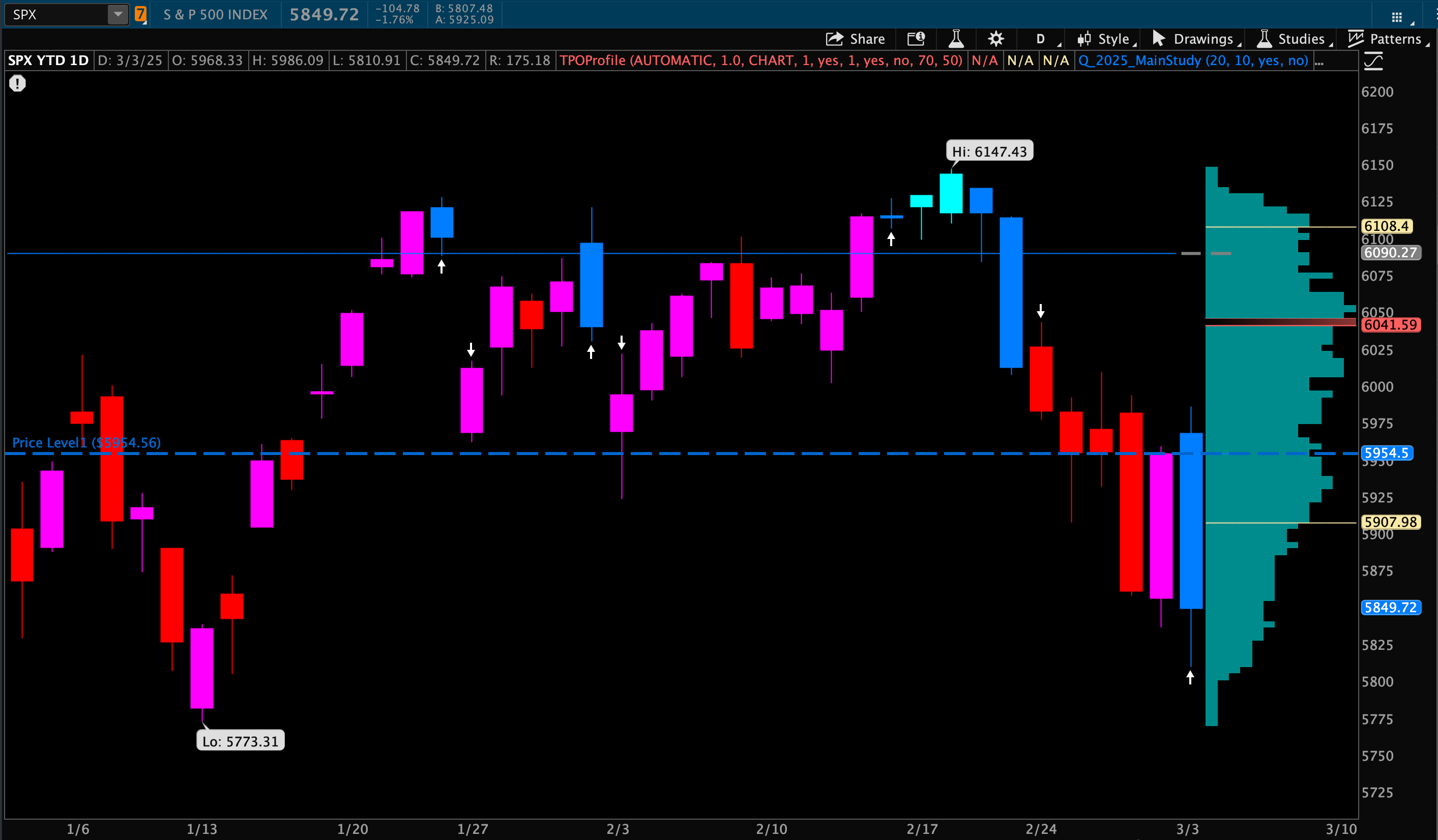 March 3, 2025 – The market continued its decline on Monday, closing down 1.76%. My model highlighted ~$5,950 on SPX, while the index closed 100 points lower at $5,849.72.